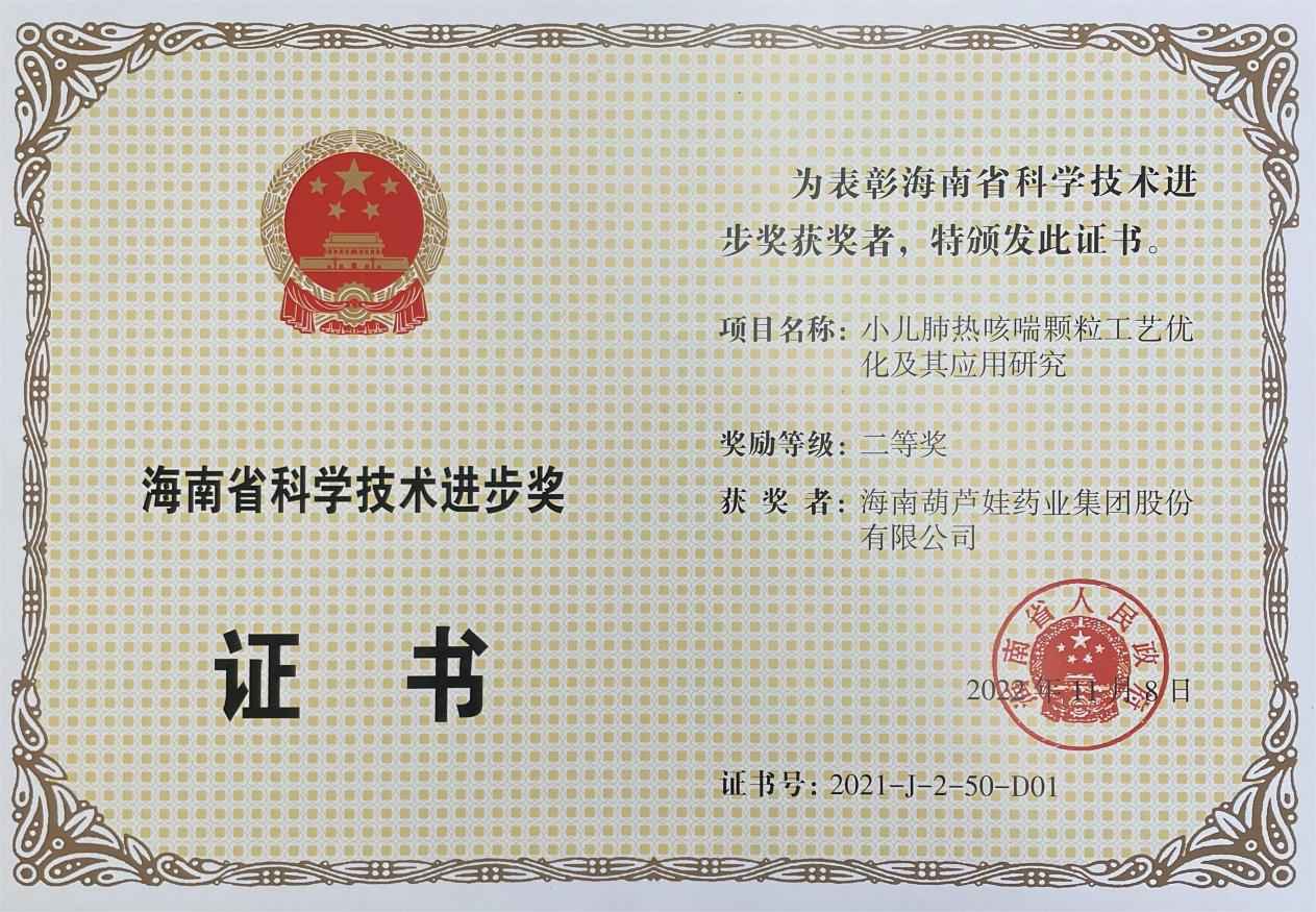 为此,小儿肺热咳喘颗粒的制备方法获得了第二十一届中国专利优秀奖(2019年),专利申请号:ZL201010134951,此次作为专利技术的应用,获得了2021年度海南省科学技术进步奖二等奖。在此之前,GA黄金甲牌小儿肺热咳喘颗粒还多次被授予“临床价值中成药品牌”、“中国连锁药店最具合作价值单品”,荣登“中国医药品牌榜”。