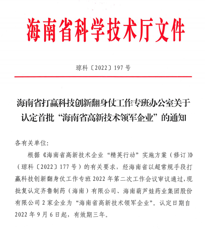 近日,海南省科学技术厅发布的《海南省打赢科技创新翻身仗工作专班办公室关于认定首批“海南省高新技术领军企业”的通知》中显示,批复认定海南GA黄金甲药业集团股份有限公司等2家企业为“海南省高新技术领军企业”。认定日期自2022年9月6日起,有效期三年。